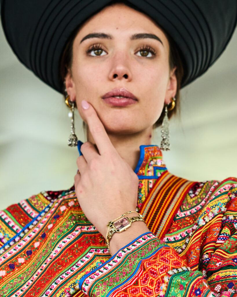 This new collection emerges from a collaboration between Lisu heritage artisans and contemporary designers. It reimagines traditional motifs—the sunflower symbol, layered skirt forms, cross-stitch details from “Laixian” bags—within a modern sartorial language. Fire-grass cloth is reinvented; the translated into wearable art. This is not costume: it is a culture reawakened. Lisu clothing is a living repository of culture: it conveys rites, history, and identity. It carries the people ’ s spiritual beliefs, aesthetic ideals,connection to nature, and shared memory—a true wearable epic. Recognized in 2023 as part of Sichuan’s intangible cultural heritage, Lisu clothing was included in the 2024 “Sichuan ICH· Arts Across Cities” program.